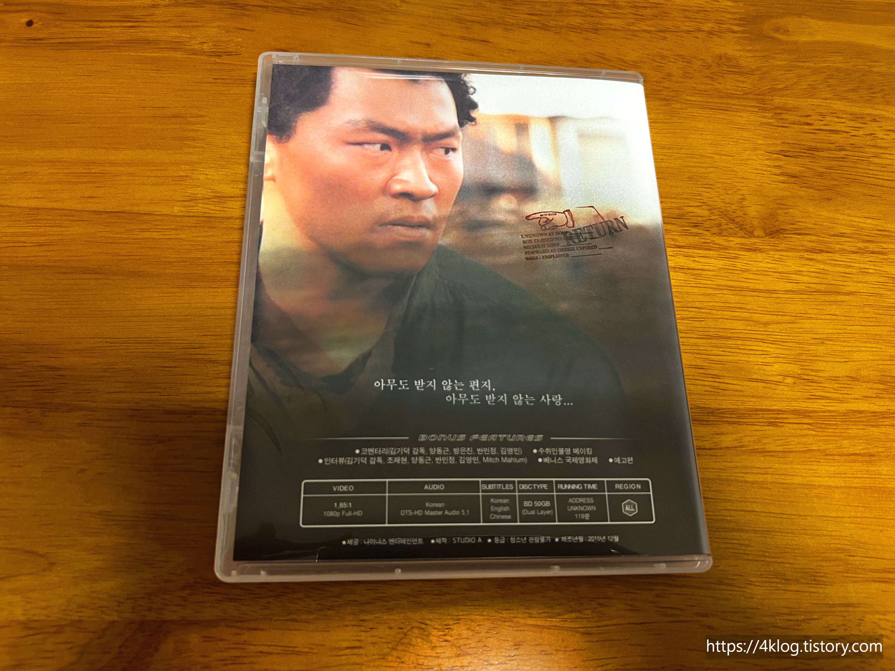 『수취인불명』은 전쟁과 분단의 후유증 속에서 살아가는 인물들의 고독과 상처를 담담하게 그린 작품이다. 김기덕 감독 특유의 거칠고도 고요한 연출이 돋보이며, 양동근과 반민정, 김영민 등 배우들의 절제된 연기가 깊은 여운을 남긴다. 패키지는 슬립박스와 북클릿 등 수집가들의 취향을 만족시키는 구성이며, 부가영상이 예상 외로 풍부하게 수록되어 있다는 점에서 충분한 소장 가치를 지닌다.