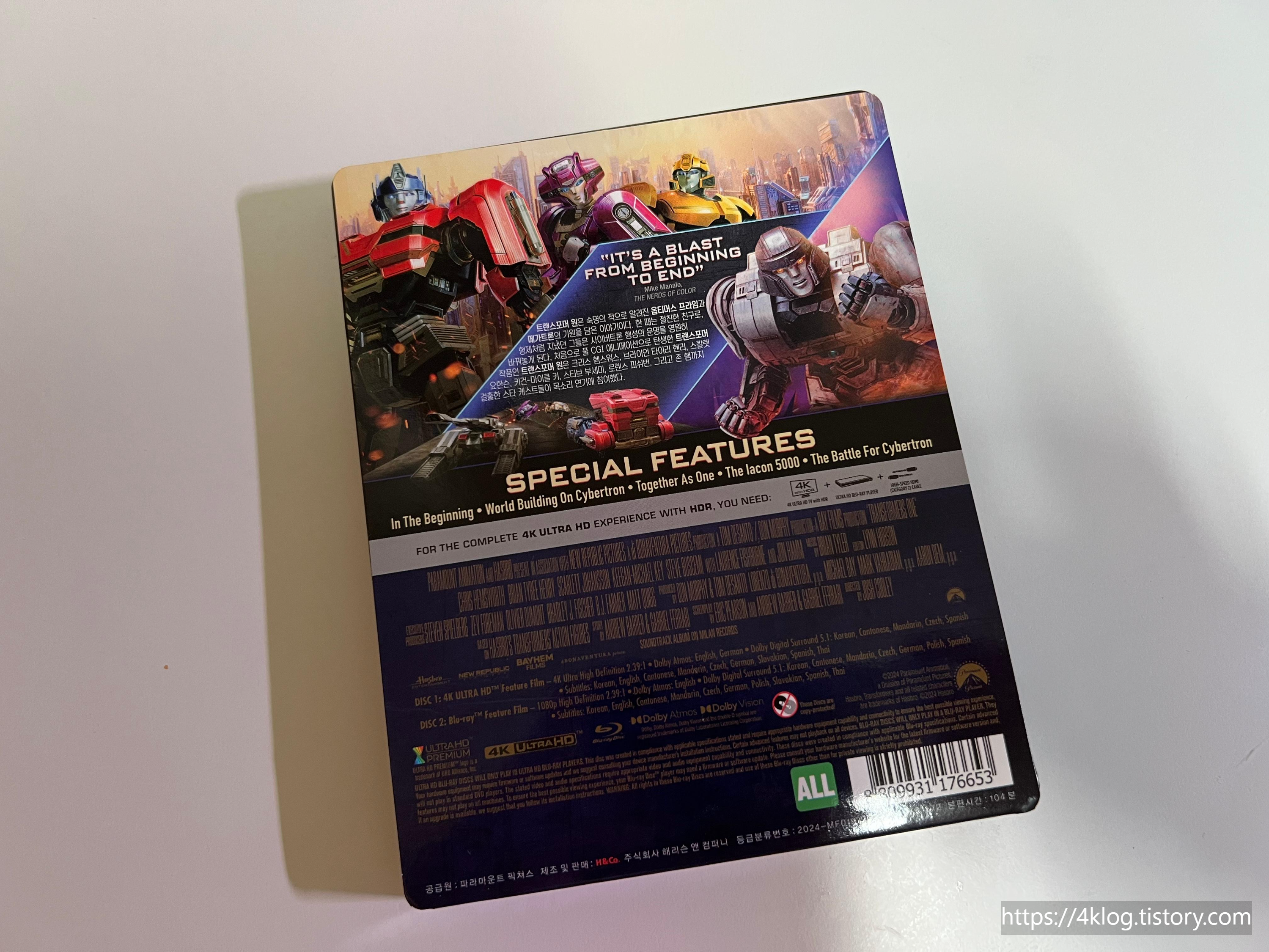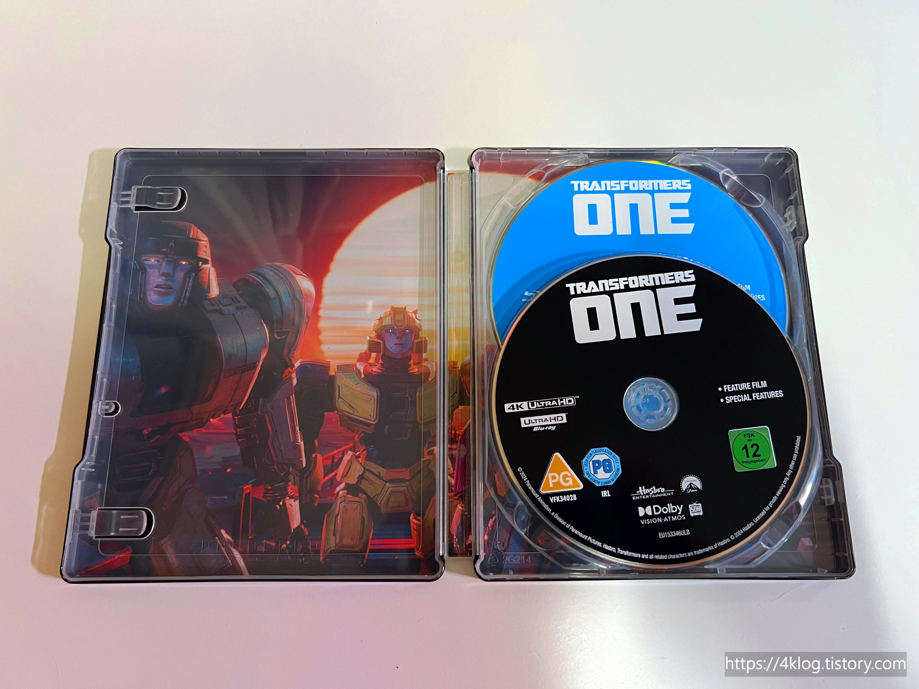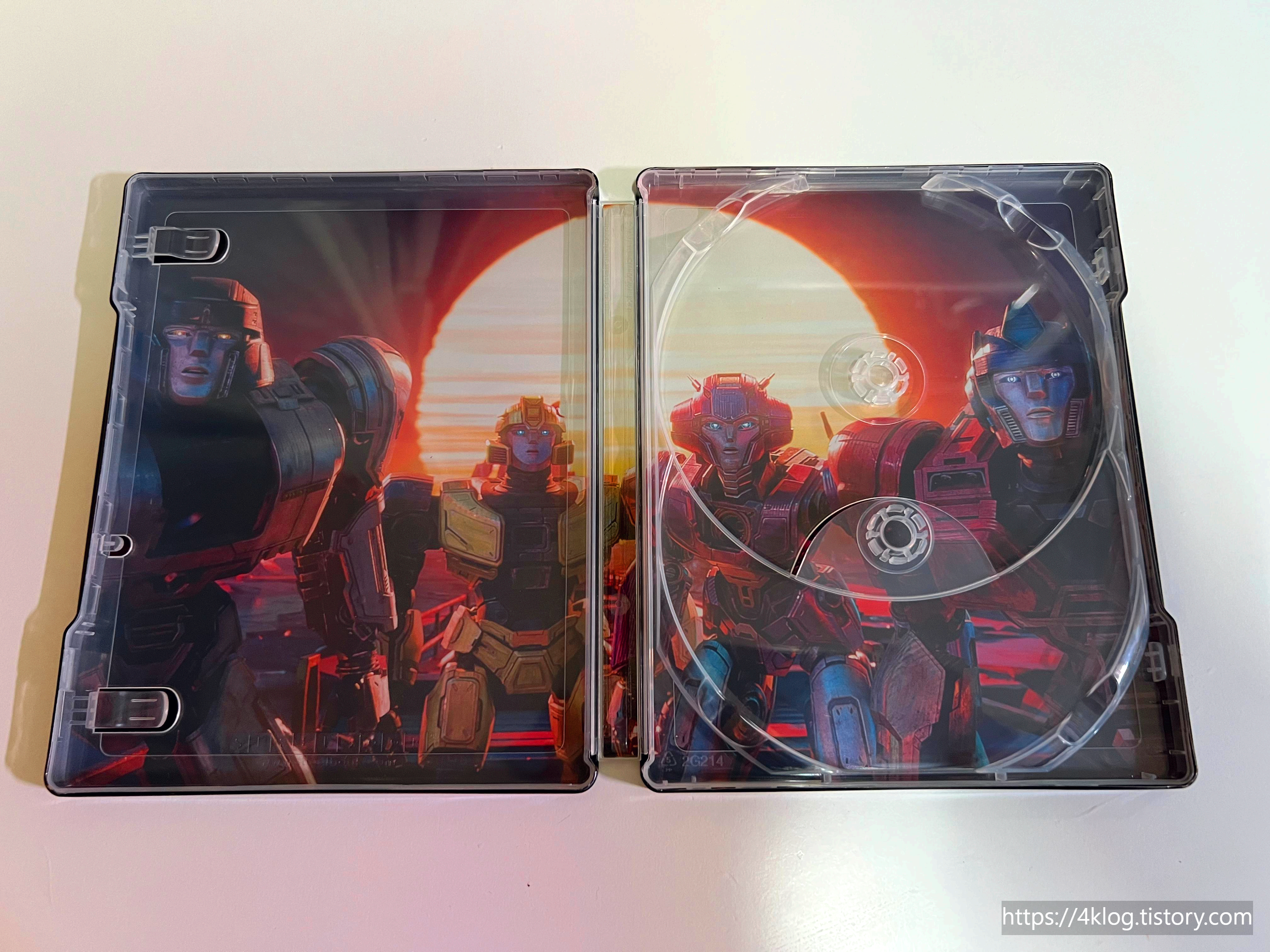 이번 트랜스포머 원 4K 블루레이는 전면 일러스트 중심의 스틸북 케이스로 제작되었으며, 내부에는 4K UHD 디스크와 블루레이 디스크가 각각 1장씩 들어 있다. 전면 커버는 사이버트론을 배경으로 한 옵티머스와 메가트론의 초기 모습이 강렬하게 인쇄되어 있으며, 후면에는 상징적인 마크와 간략한 문구가 깔끔하게 구성되어 있다.
