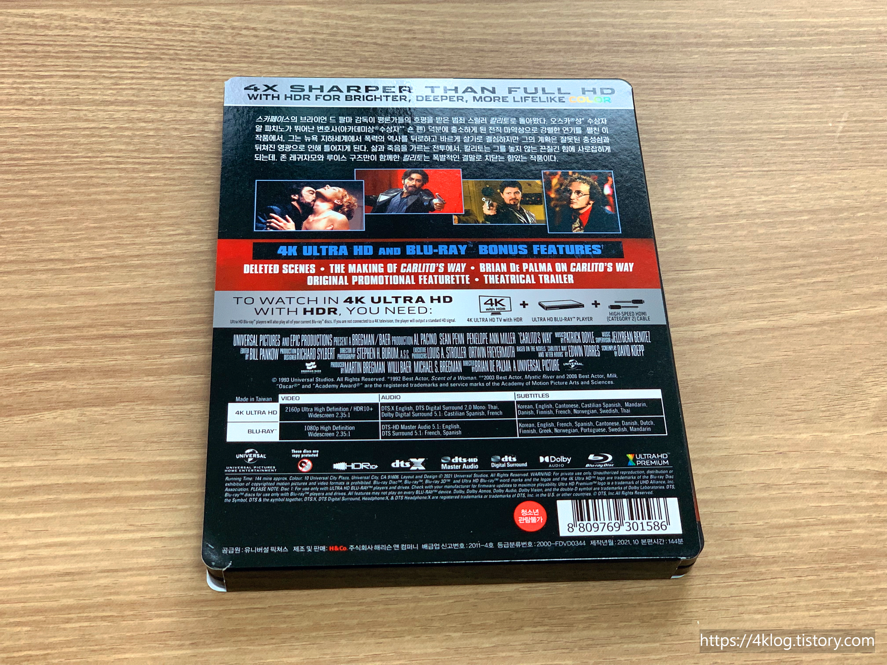 『칼리토』는 브라이언 드 팔마 감독의 누아르 감성이 정점에 이른 작품으로, 이번 4K 리마스터 버전은 그 정수를 보다 선명한 화질로 되살려낸다. 무엇보다 DTS:X 사운드가 수록되어 있어 총격이나 배경음악, 대사의 입체감이 상당하다.