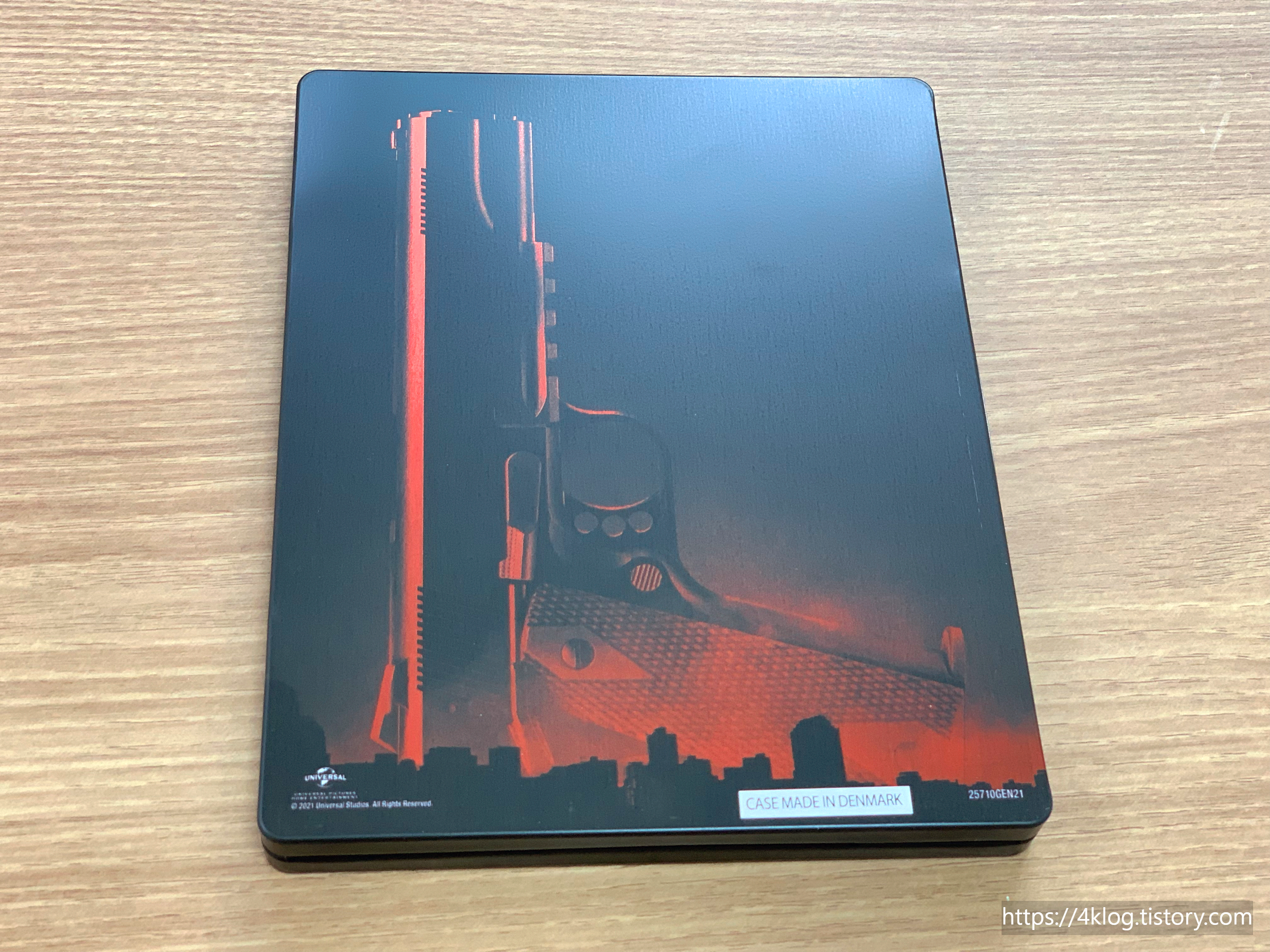 스틸북 뒷면은 검정 배경 위에 권총 일러스트가 배치되어 있고, 내부는 영화 속 레스토랑 장면이 풀샷으로 인쇄되어 있다. 이 장면은 칼리토와 데이브가 미래에 대해 대화하는 인상 깊은 시퀀스로, 내부 삽화 선택도 꽤 적절하다.