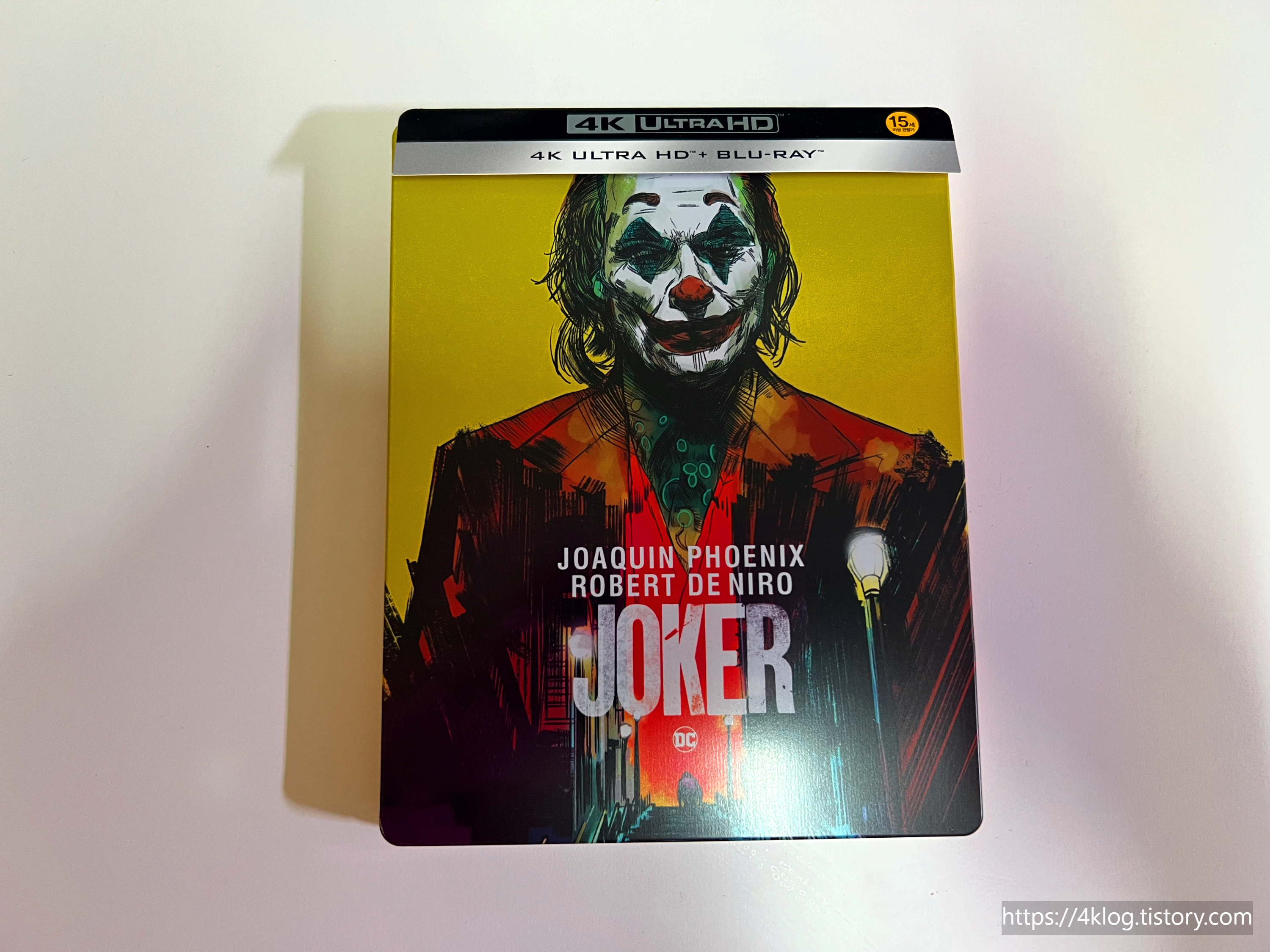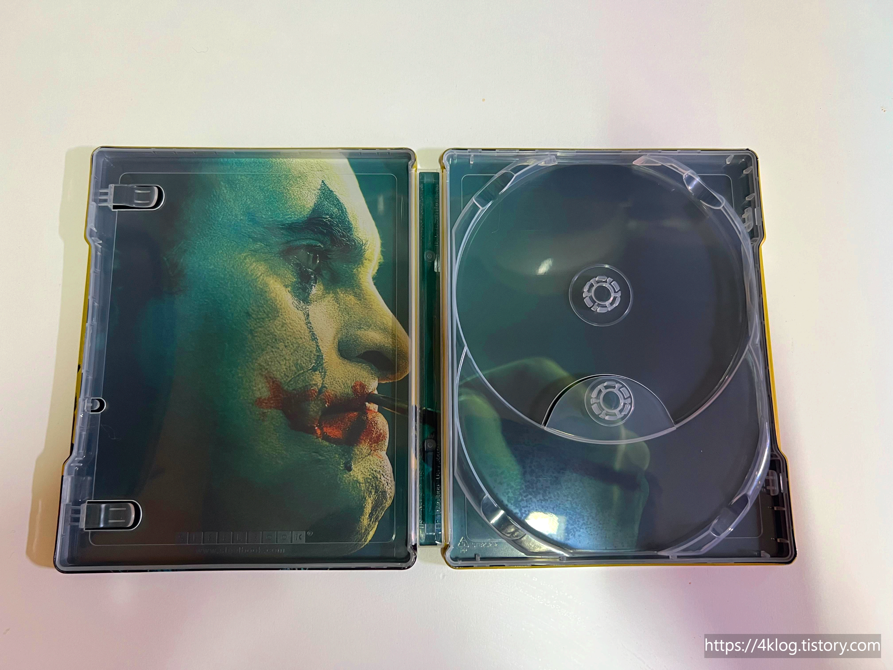 내부에는 조커 클로즈업 이미지가 인쇄되어 있으며, 4K UHD 디스크는 빨간색, 블루레이 디스크는 검정 바탕에 조커 로고가 인쇄된 형태다. 전체적으로 컬러 대비가 강하면서도 일관된 시각적 인상을 준다.