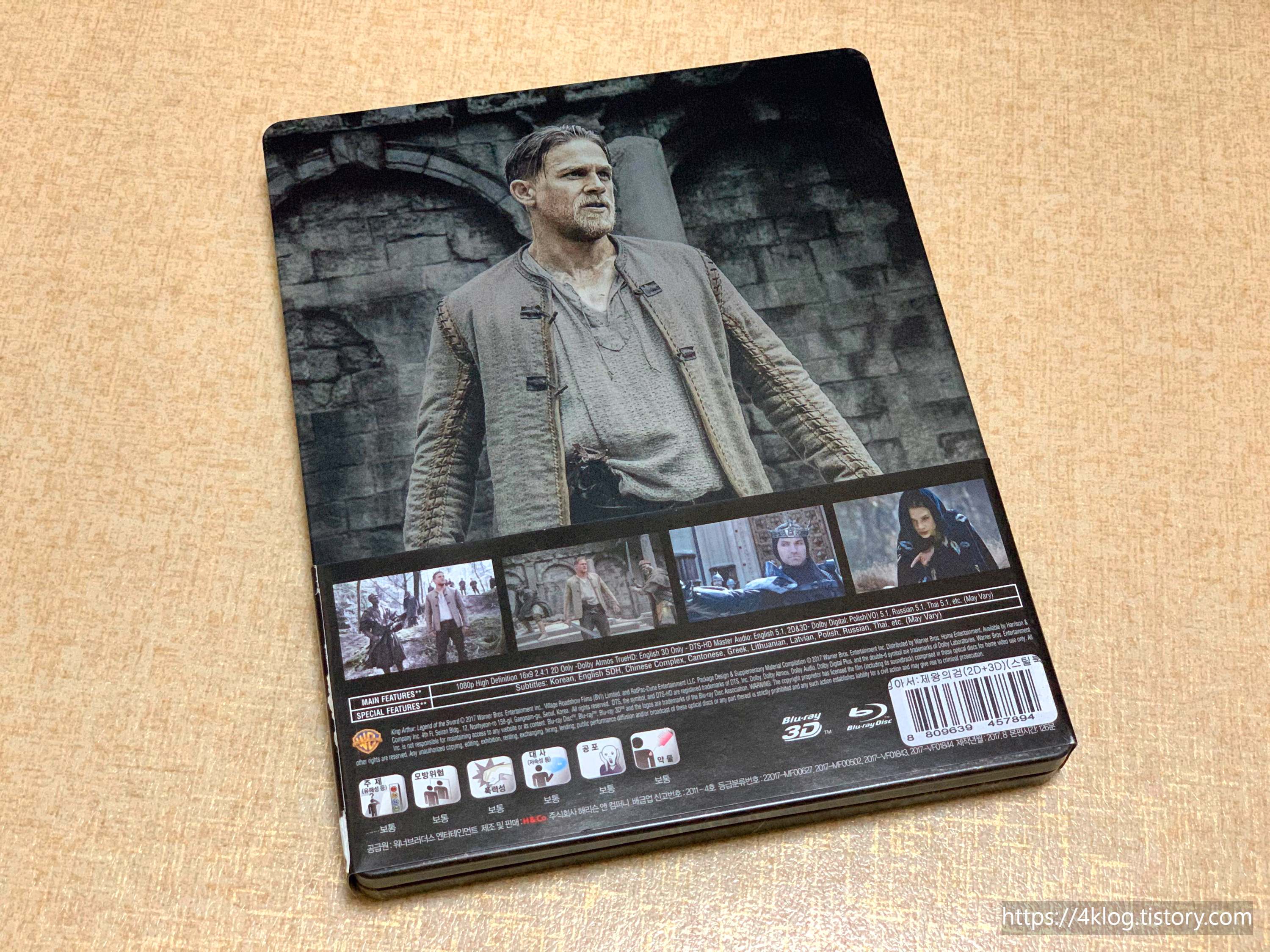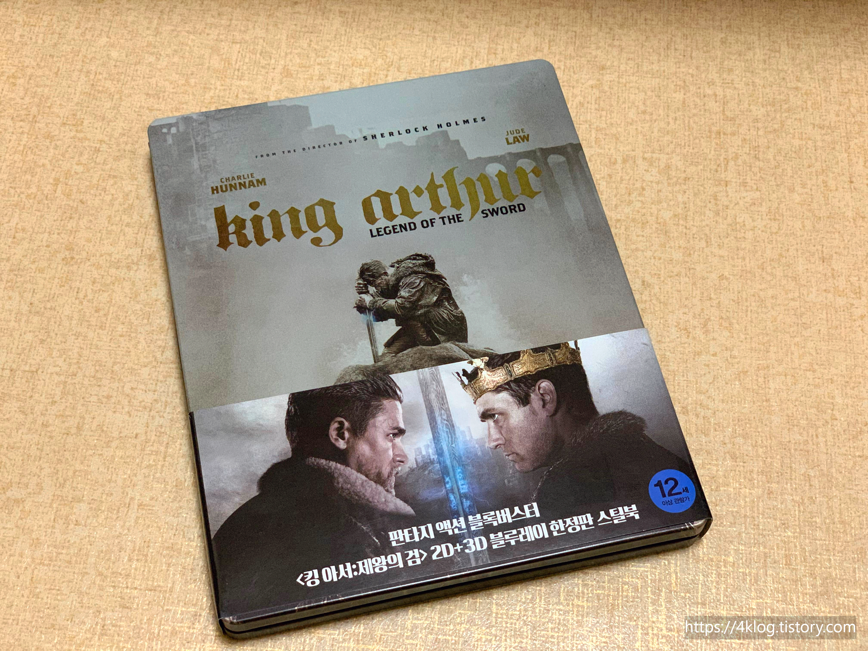 스틸북 케이스로 출시된 이 블루레이는 전면에 킹 아서와 반대편의 캐릭터가 마주한 구성으로, 가이 리치 특유의 스타일을 시각적으로 드러낸다. 후면에는 주인공 찰리 허냄의 단독 이미지가 배치되어 있으며, 내부에는 디스크 2장(2D+3D)과 광고지 1장이 동봉되어 있습니다. 디스크 프린팅은 무광 블랙에 흰색 로고가 인상적이다.