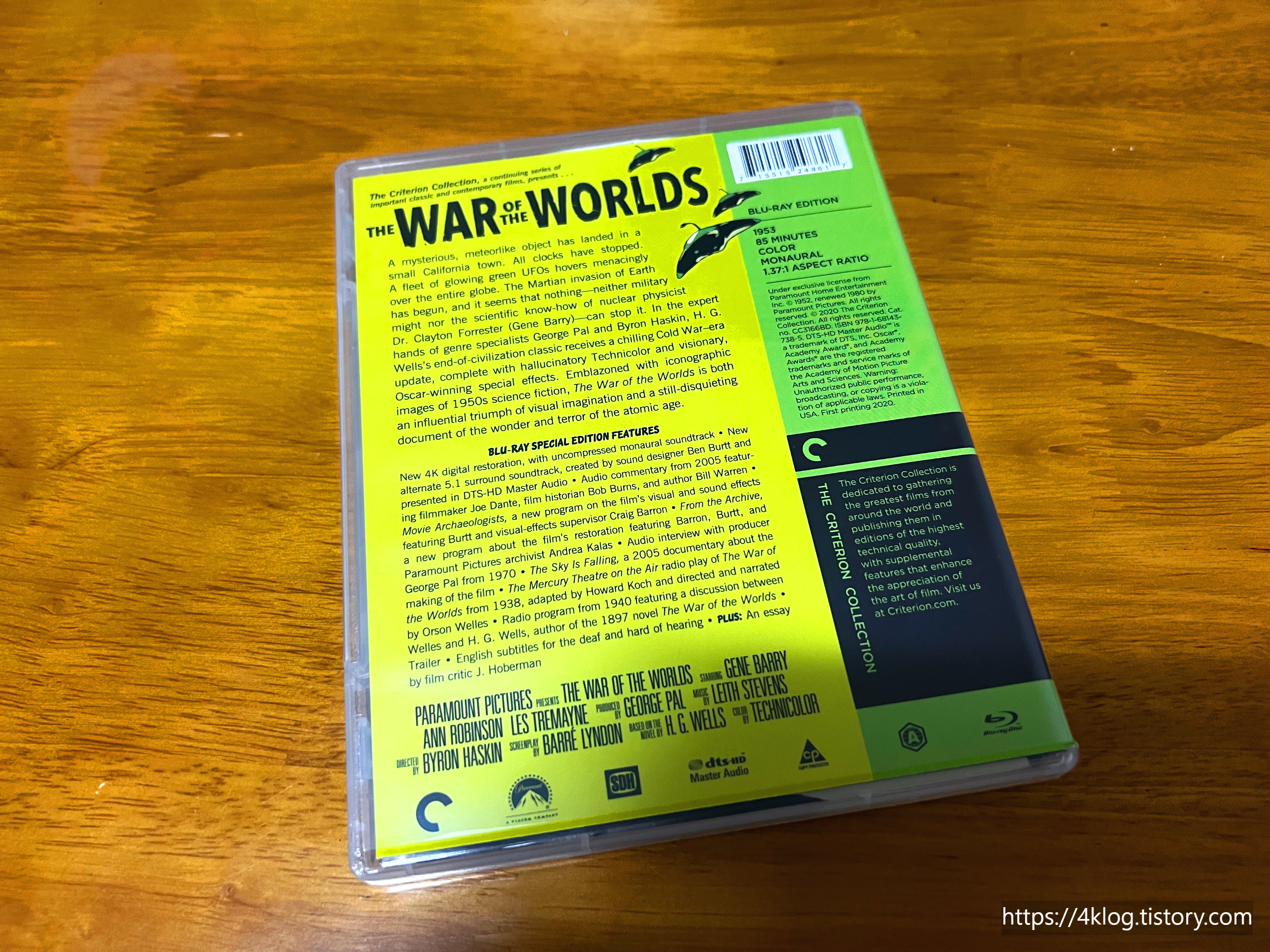 『The War of the Worlds』는 H.G. 웰스의 고전 SF 소설을 원작으로, 1950년대 테크놀러 필름이 구현할 수 있었던 최고의 컬러감과 특수효과를 보여주는 작품이다. 이번 블루레이는 4K 리마스터를 통해 보다 선명한 영상과 정제된 색보정을 제공하며, 음성도 오리지널 모노뿐 아니라 5.1로도 감상이 가능해졌다.