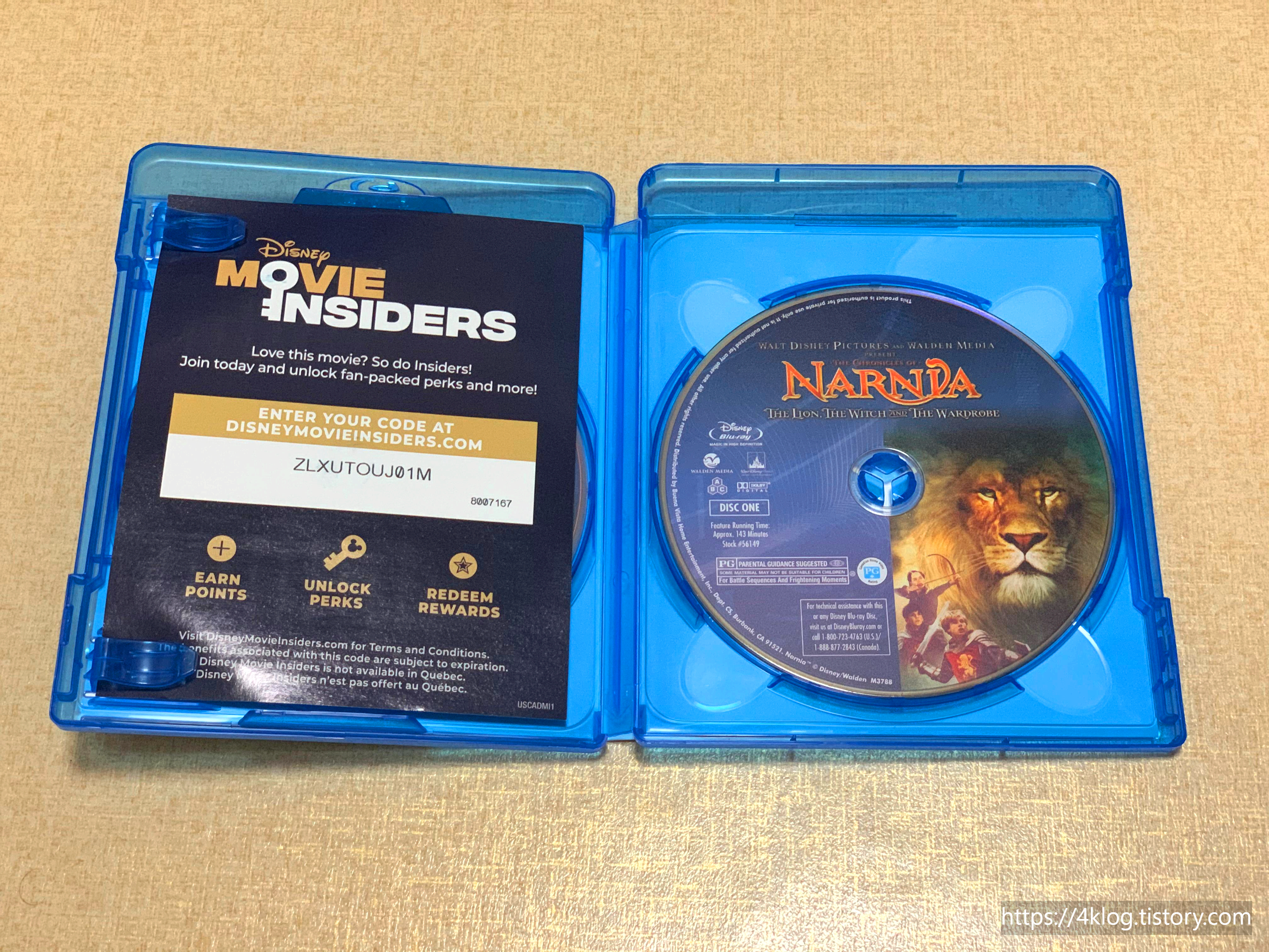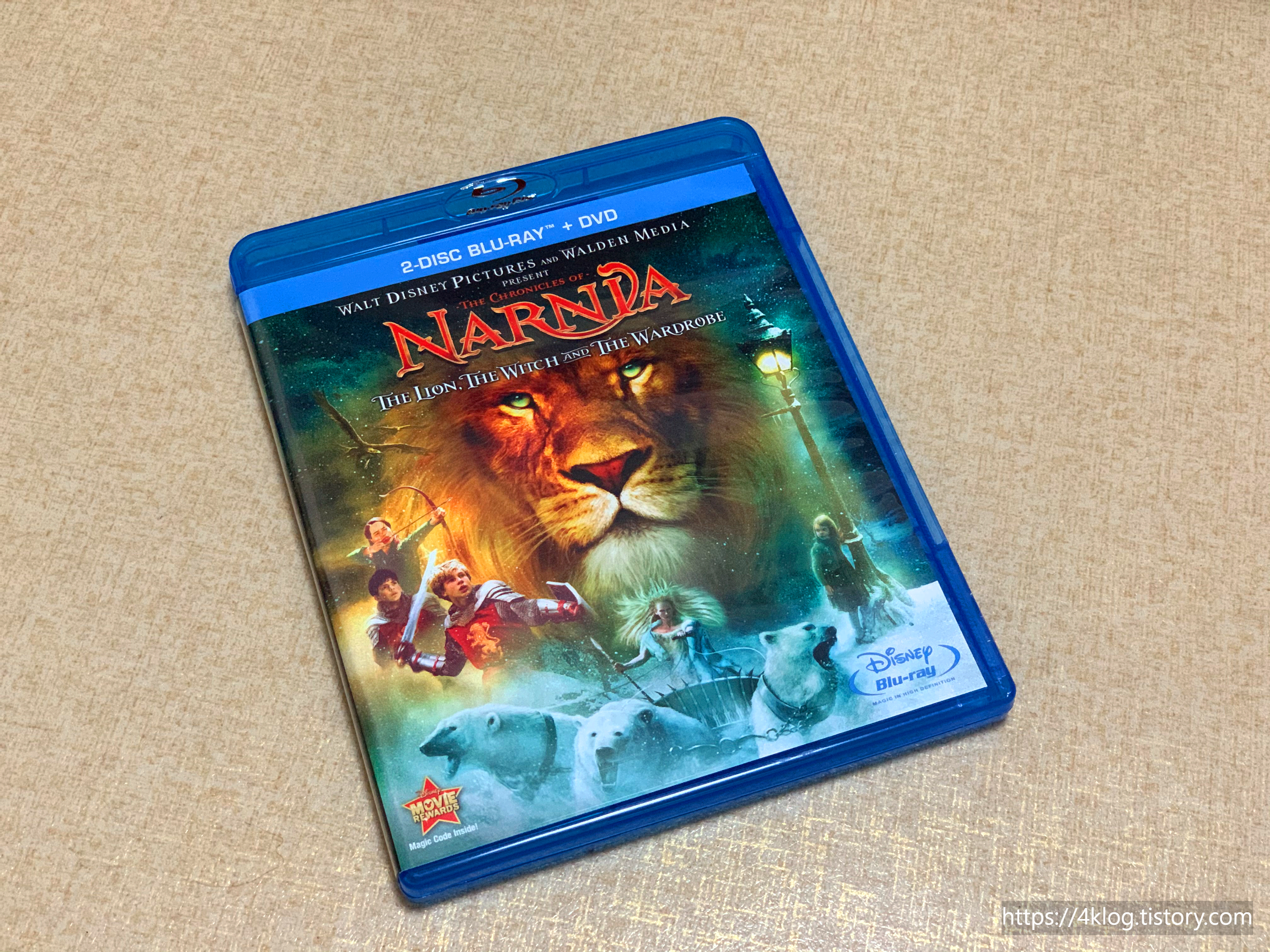 디즈니 해외판 블루레이답게 패키징은 깔끔하고 직관적이다. 블루 케이스 전면에는 나니아의 상징인 아슬란과 주요 캐릭터들이 중심을 이루는 화려한 일러스트가 배치되어 있다. 후면에는 3디스크 구성과 주요 부가영상 설명이 강조되어 있으며, 상단에는 3-Disc Combo Pack 문구가 눈에 띈다. 내부에는 블루레이 2장과 DVD 1장이 수납되어 있으며, 디즈니 무비 인사이더스 코드 카드도 포함되어 있다.