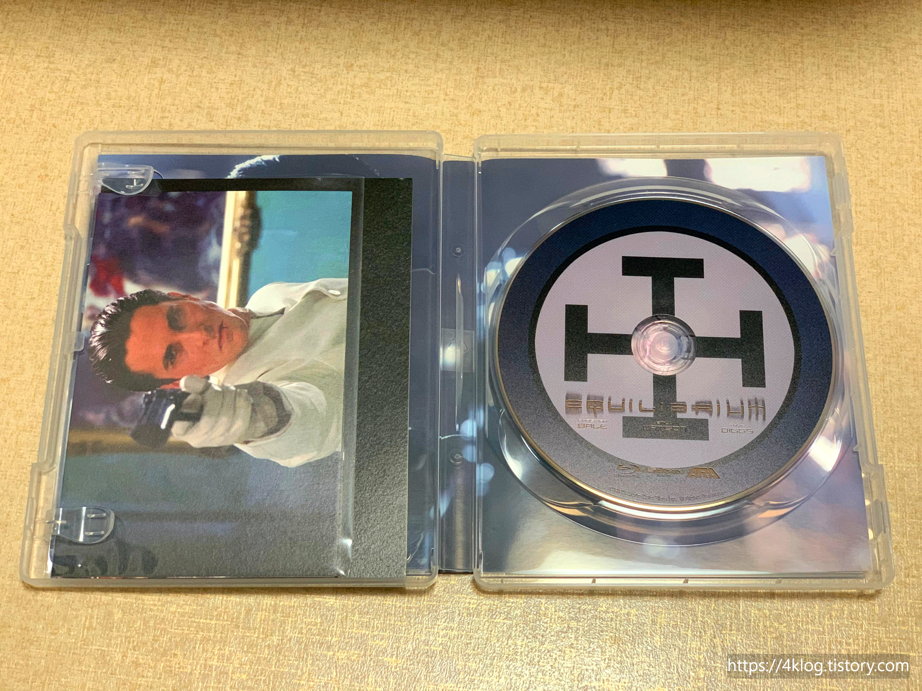 SF와 액션의 접점을 흥미롭게 공략한 <이퀼리브리엄>은 감정을 통제하는 사회라는 설정 속에서 ‘건카타’라는 독창적인 액션 미학을 선보이며 컬트 클래식으로 자리 잡았다. 비록 영상 비율이 원본 2.39:1이 아닌 1.78:1로 수록된 점은 큰 아쉬움으로 남지만, DTS-HD MA 5.1 오디오는 총격전과 음악 모두를 안정적으로 담아낸다. 구성품은 최소화되어 있으나, 전체적인 인쇄 퀄리티와 패키징은 만족스러운 편이다. 작품에 대한 애정이 있다면 충분히 소장할 만한 판본.