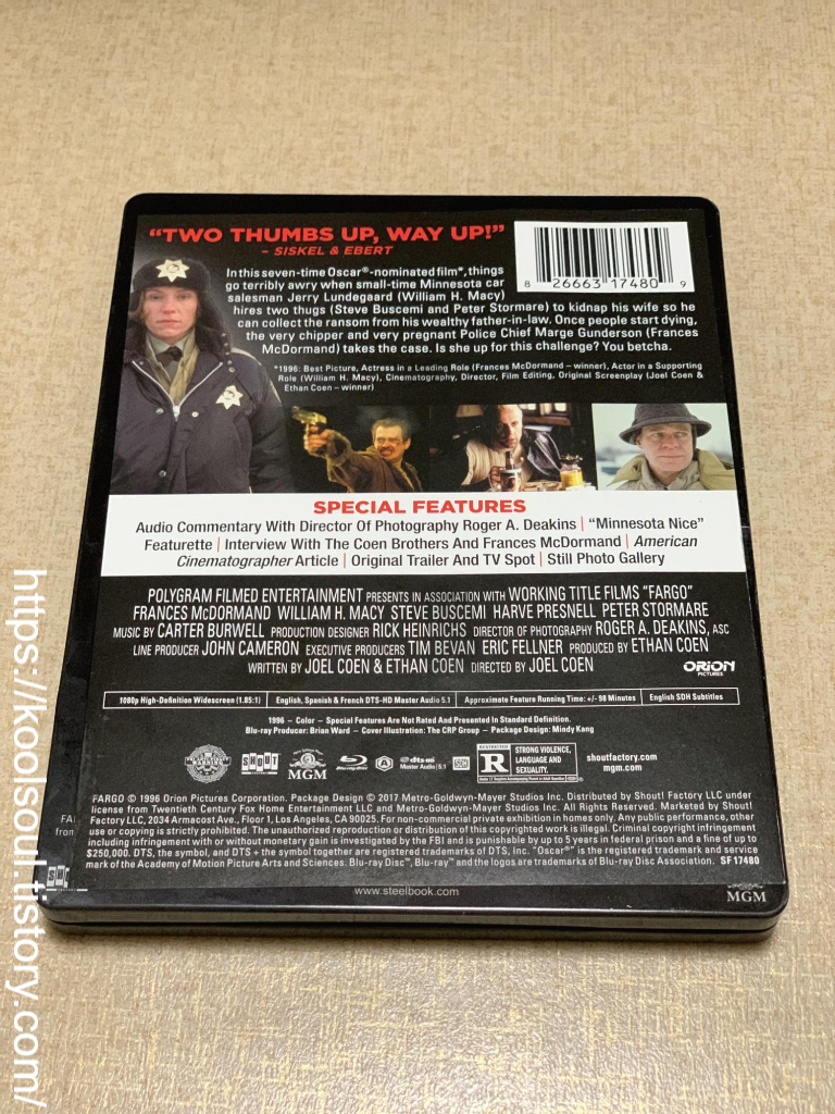 코엔 형제 필모그래피의 정점 중 하나인 파고 (FARGO)의 20주년 기념 스틸북 블루레이 개봉기입니다. 이 타이틀은 북미 레이블 Shout Factory에서 한정판으로 출시되었으며, 영화의 냉소적이고 어두운 유머가 담긴 아트워크로 수집가들에게 높은 평가를 받았습니다.