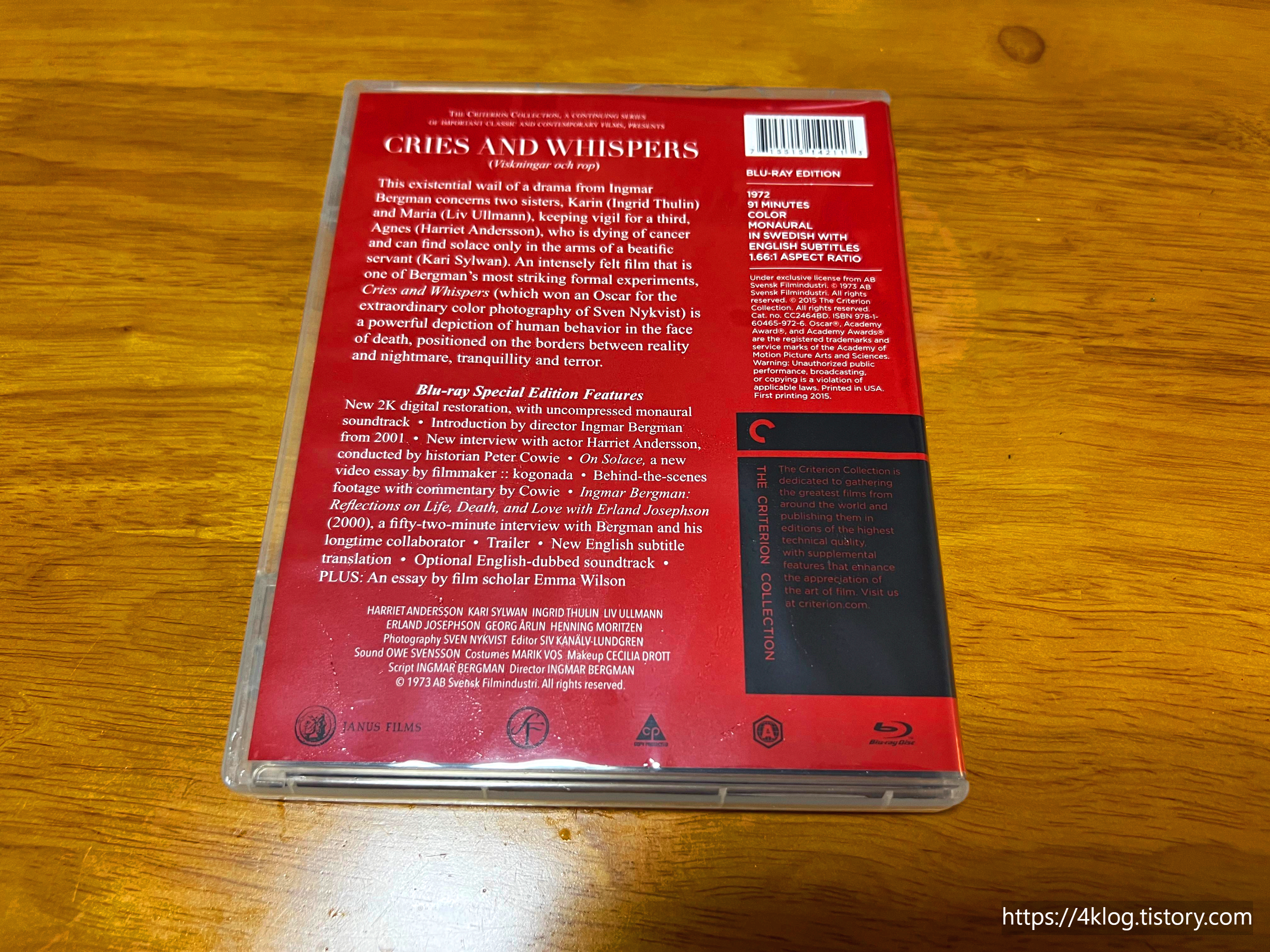 스웨덴의 거장 잉마르 베리만 감독의 대표작 중 하나인 '외침과 속삭임'의 크라이테리언 콜렉션(The Criterion Collection, Spine #34) 블루레이 개봉기입니다. 이 타이틀은 베리만 영화의 특유의 붉은 미장센과 심리적 강렬함을 2K 디지털 복원으로 완벽하게 재현했습니다.
