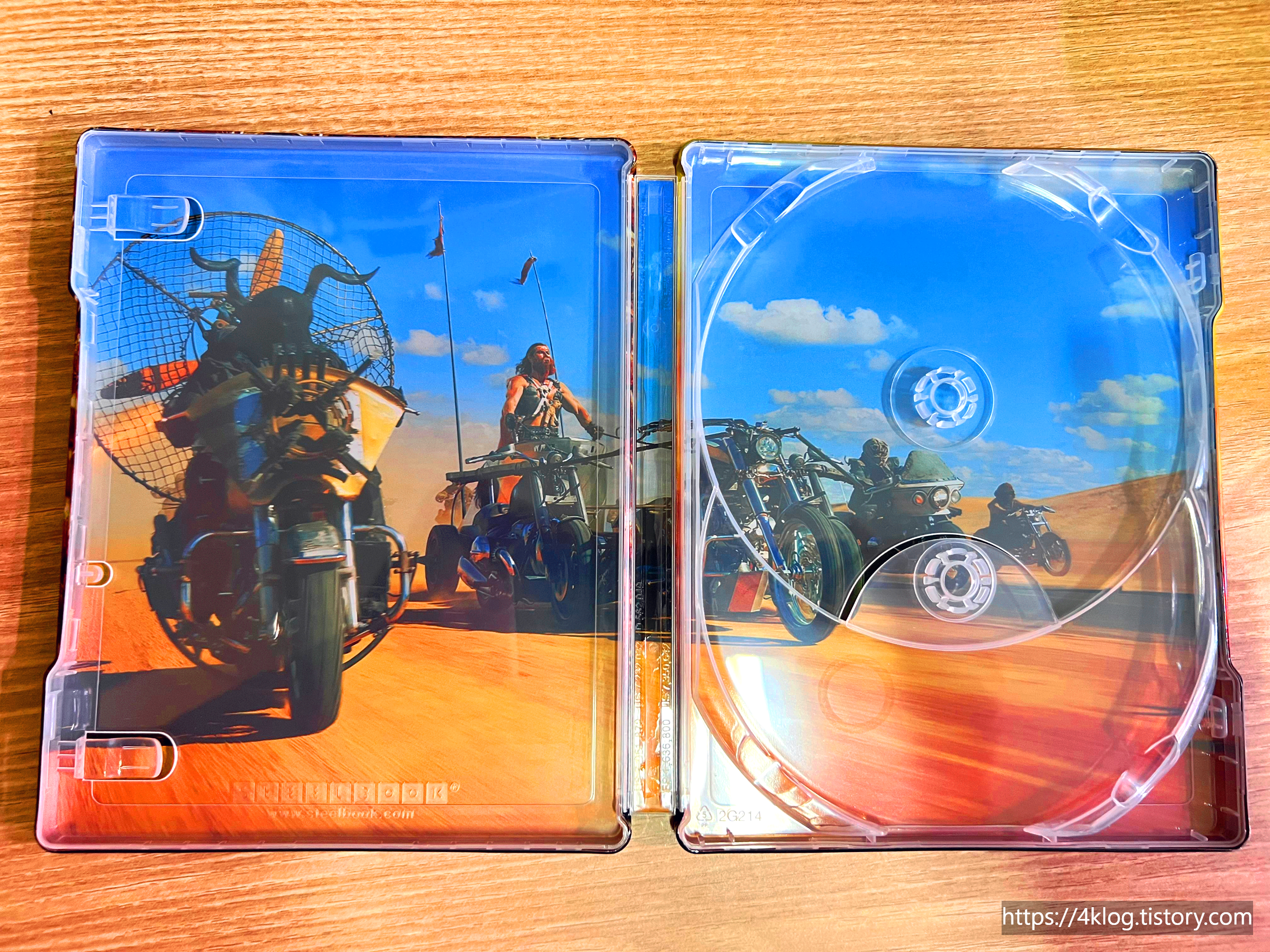 - 내부 아트워크: 스틸북을 펼치면 퓨리오사와 디멘투스가 탑승한 차량이 황무지를 질주하는 장면이 펼쳐지며, 액션의 시퀀스를 완벽하게 재현합니다.