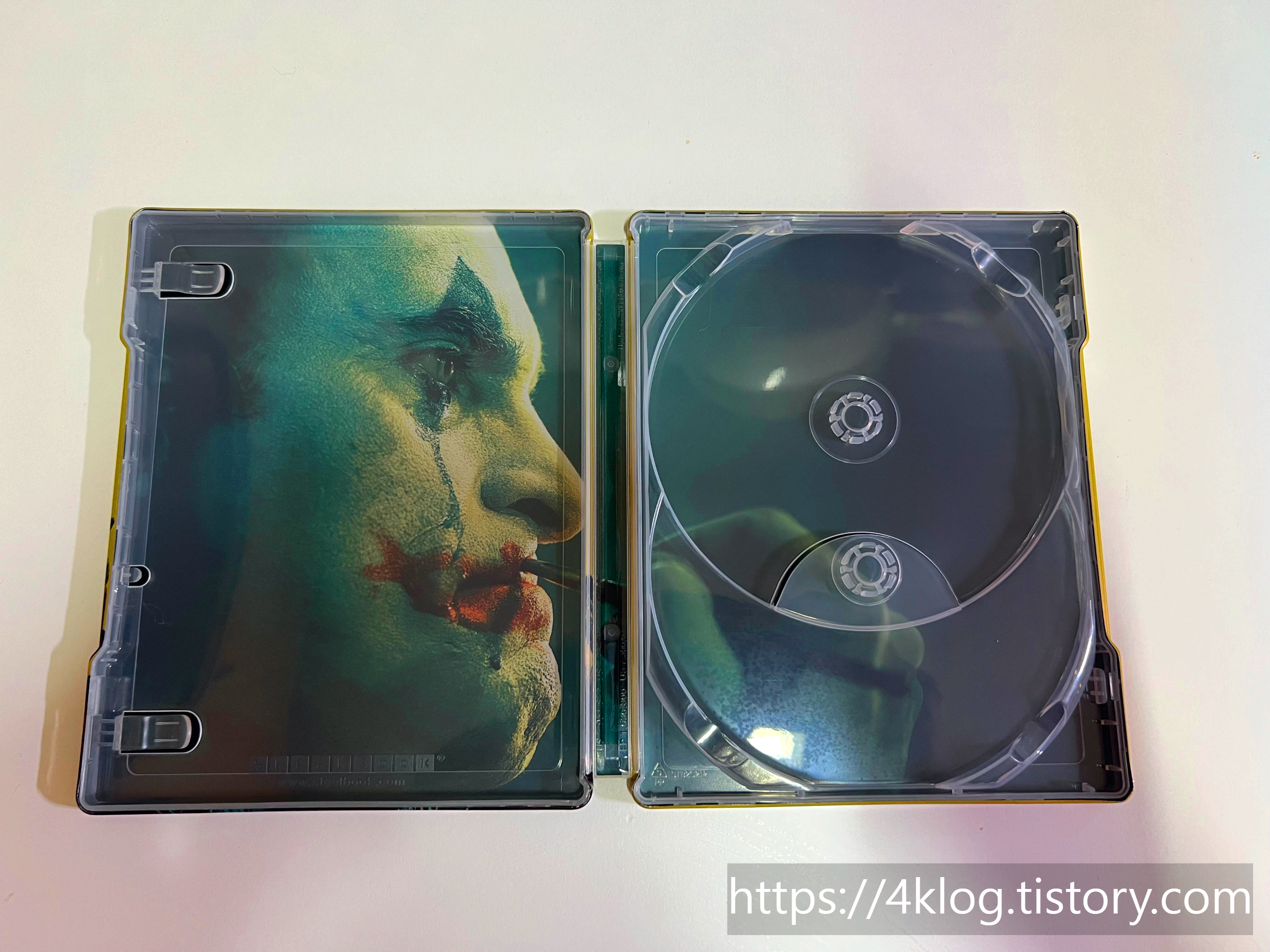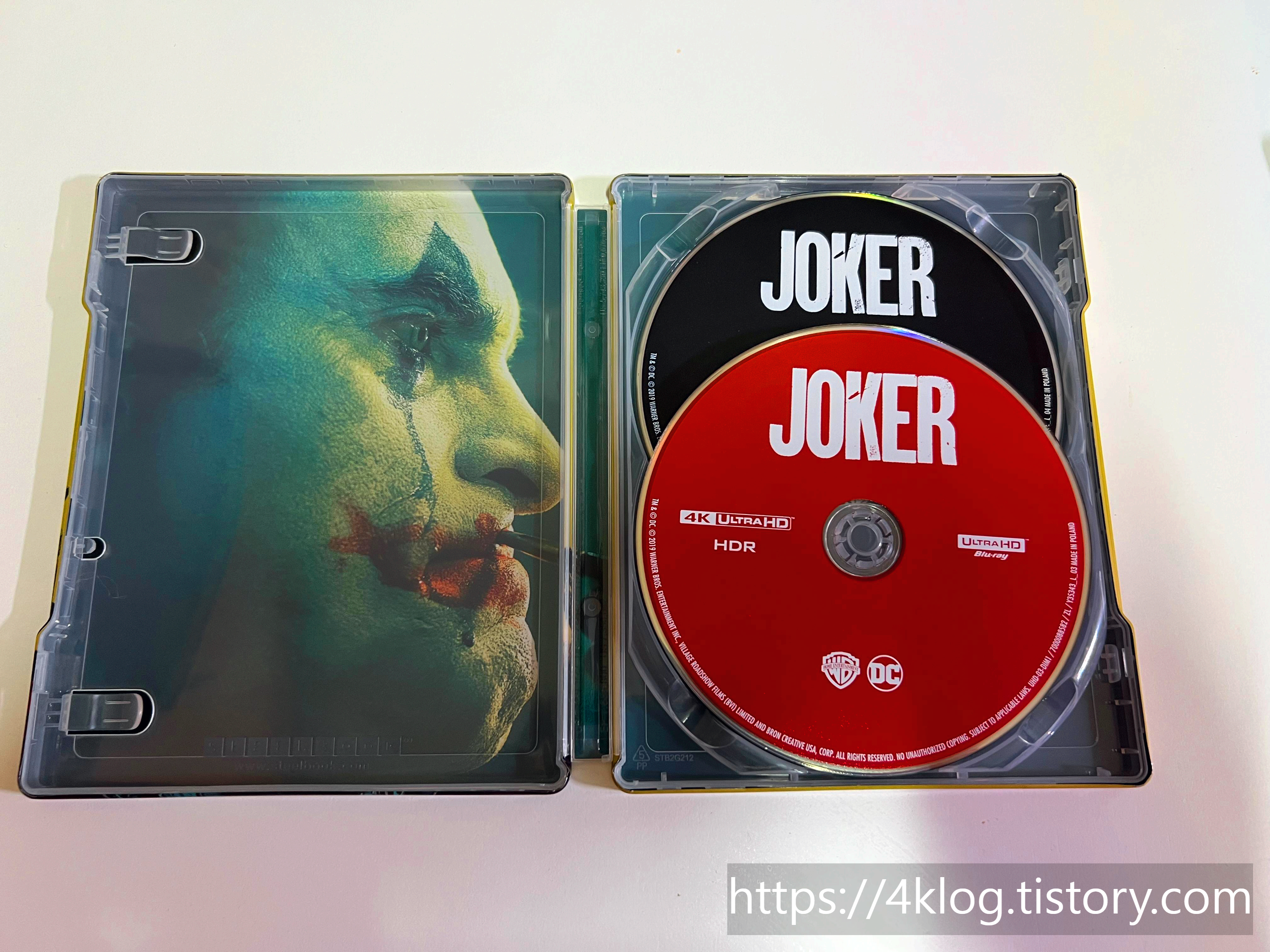 내부 아트워크는 조커의 얼굴 클로즈업 이미지로 꾸며져 있으며, 투디스크 수납이 가능한 트레이가 안정적으로 배치돼 있다. 4K UHD 디스크는 빨간색, 2K BD 디스크는 검정색 디자인으로 컬러 톤을 대비시켰다.