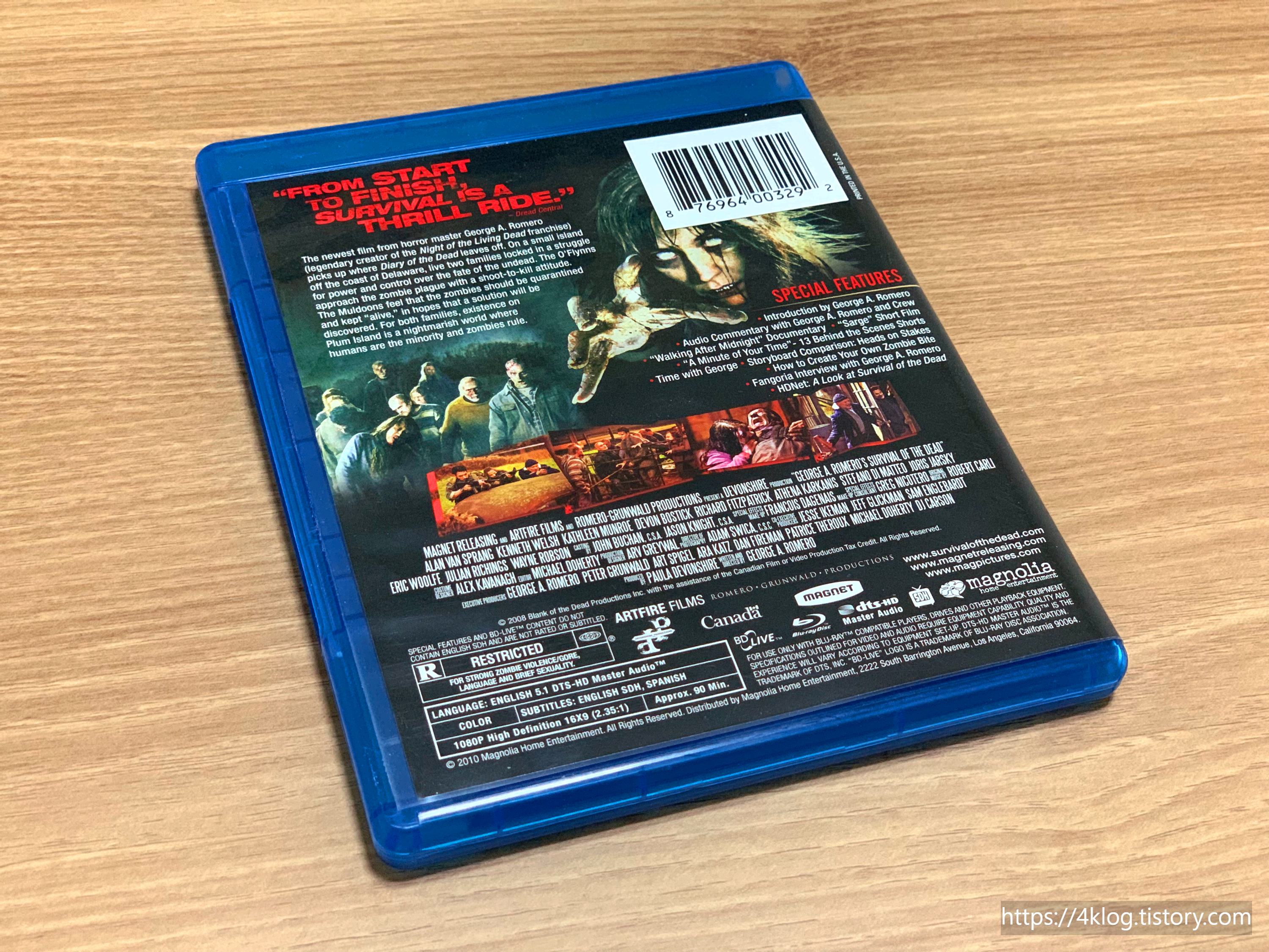 로메로의 세계관을 ‘섬’이라는 공간에 얹은 후기작. 평은 엇갈리지만, 블루레이는 1080p 전송과 탄탄한 5.1 사운드로 총성과 물살, 좀비 신음까지 공간감을 준수하게 살리고 있다. 무엇보다 감독 코멘터리·메이킹 다큐·분장 튜토리얼 등 보너스가 풍성해 제작 의도를 따라가며 보는 재미가 큰데, 영화는 완전 별로다.