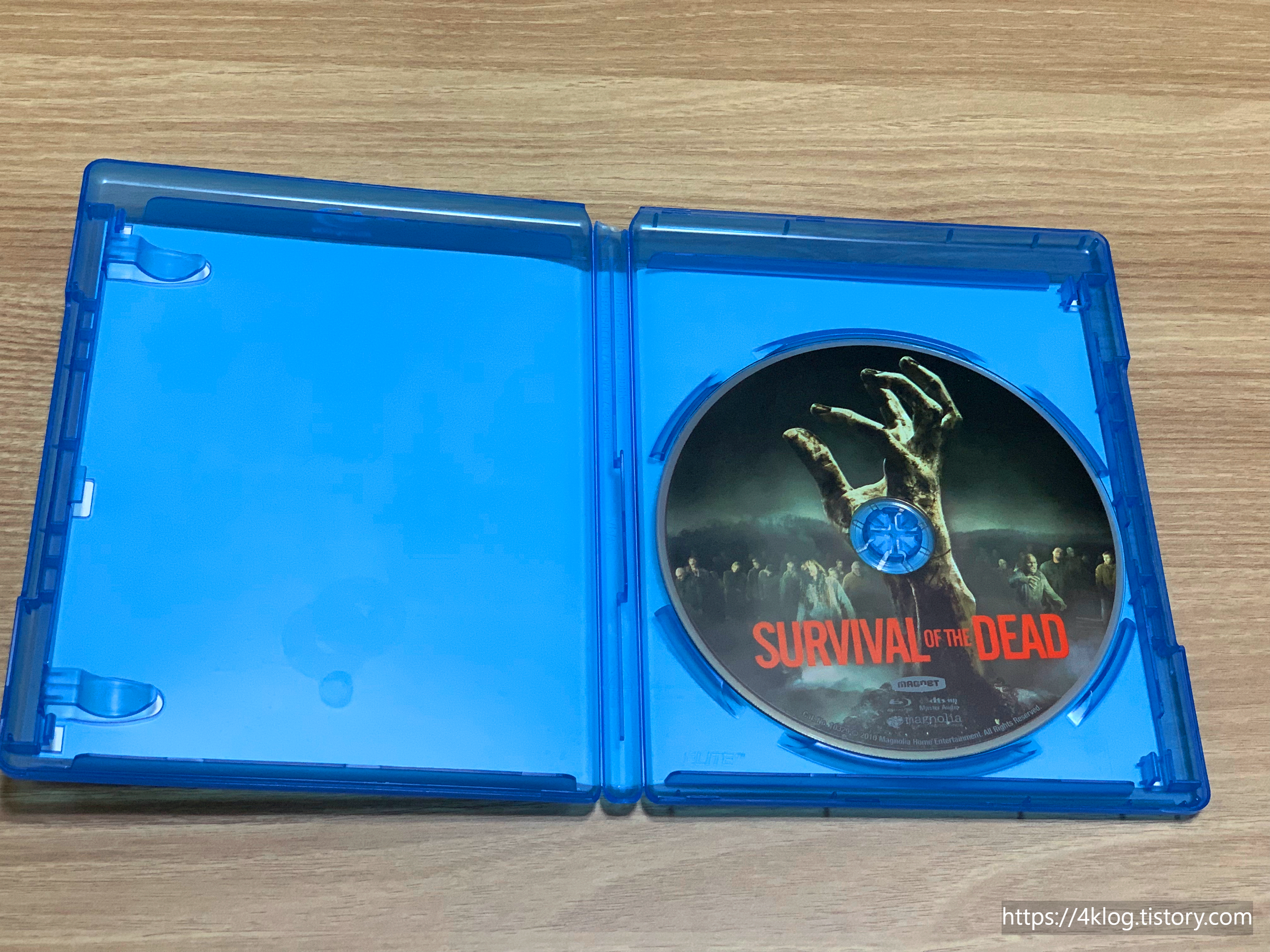 이번 ‘서바이벌 오브 더 데드’ 블루레이 패키지는 전형적인 해외판 아마레이 케이스 형식을 따르지만, 커버 아트가 영화의 톤과 분위기를 잘 살린 강렬한 디자인이다. 전면에는 붉은빛과 어두운 톤이 대비되는 메인 포스터 이미지가 인쇄되어 있어 좀비물 특유의 긴장감을 전달한다. 후면에는 영화 소개와 스틸컷, 스펙 및 부가영상 목록이 깔끔하게 배치되어 있다.