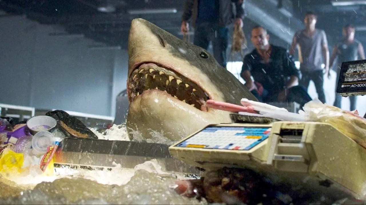 영화의 초반은 비교적 평범하다. 해변 마을에서 일어난 강도 사건, 쓰나미의 급습, 그리고 순식간에 바닷물로 잠긴 도심. 하지만 진짜 이야기는 폐허가 된 슈퍼마켓 내부에서 시작된다. 건물은 무너지고 전력은 끊겼으며, 천장까지 물이 차오른 그곳은 어느새 거대한 수조처럼 변한다. 그리고 그 안에 상어 두 마리가 들어온다. 말 그대로 “슈퍼마켓 수조 속 상어”다.