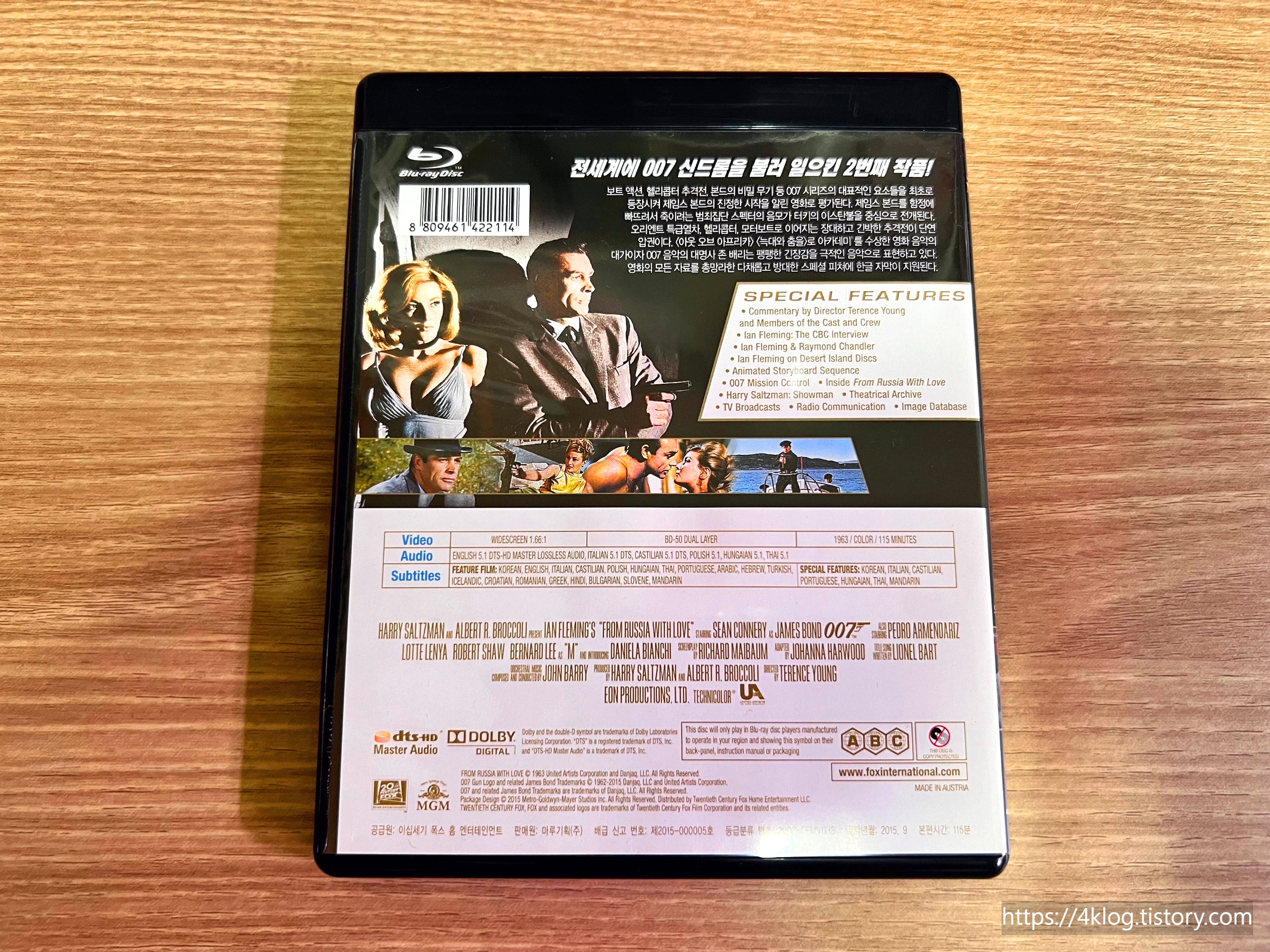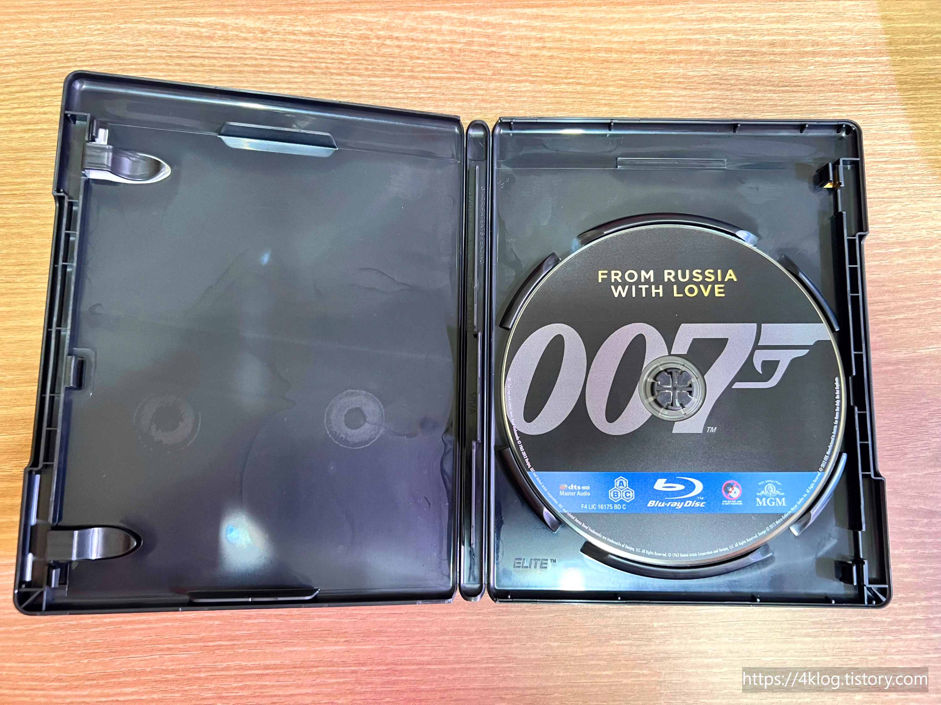 케이스는 블랙 엘리트 케이스이며, 슬리브 없이 전면에는 007 시리즈 고유의 디자인이 적용되어 있다. 숀 코너리의 정중한 슈트 차림이 클래식한 분위기를 물씬 풍긴다. 후면에는 스틸컷과 상세 스펙이 정리되어 있고, 내부에는 단일 디스크와 간결한 구성이다. 디스크 레이블 디자인은 간결하고 클래식한 로고 위주다.