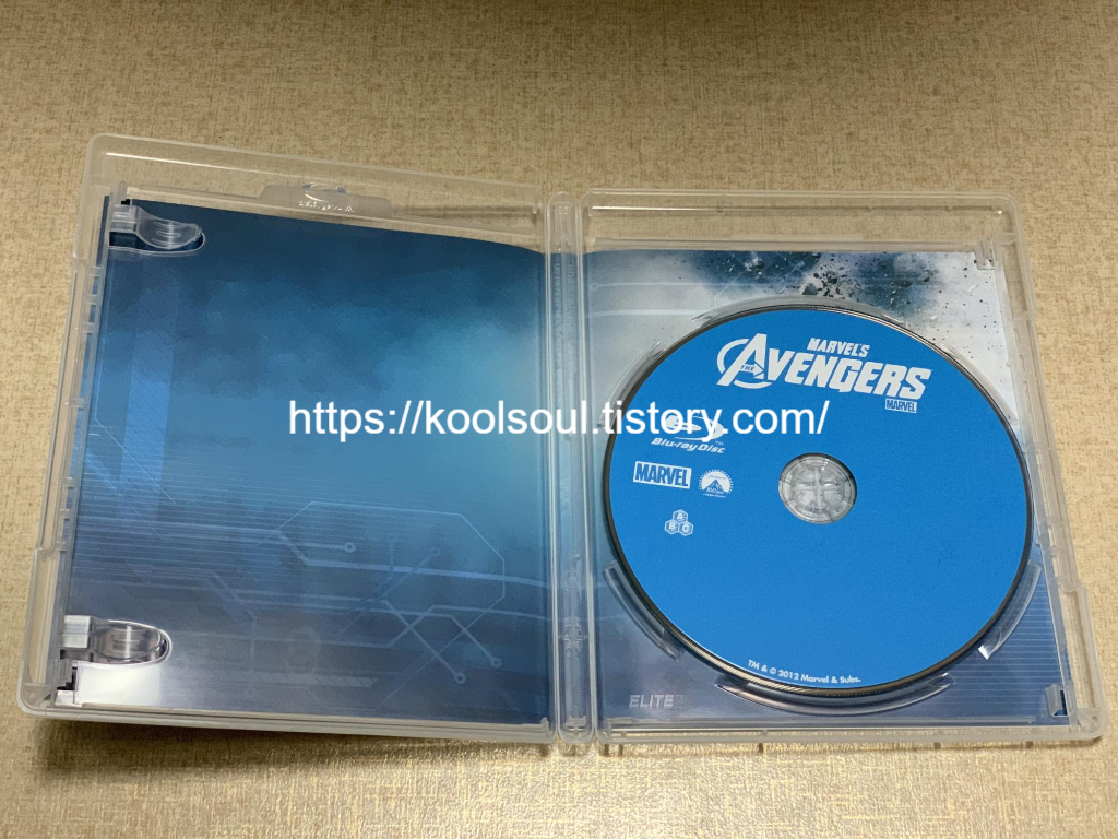 - 설명: 슬립커버와 내부 킵케이스의 전면 아트는 동일한 오리지널 극장용 포스터 이미지를 사용했습니다. 중앙의 타노스와 인피니티 건틀렛을 중심으로 아이언맨, 캡틴 아메리카, 토르 등 수많은 히어로들이 우주를 배경으로 장엄하게 배치되어 있습니다. 특유의 보랏빛과 붉은빛의 우주적 색감이 블루레이 패키지에 아주 선명하게 인쇄되었습니다.