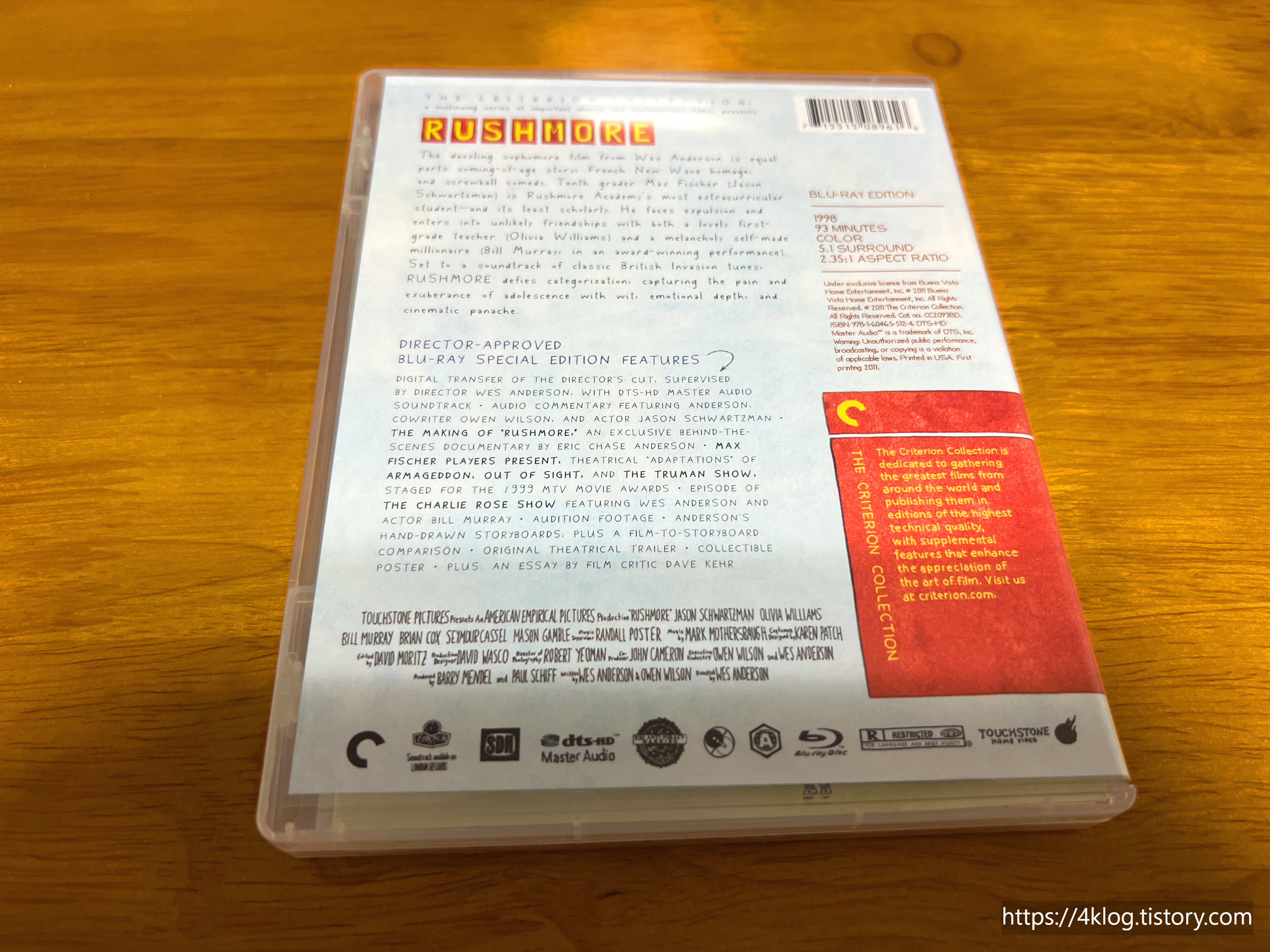 웨스 앤더슨의 초기작 중에서도 독보적인 스타일이 완성된 작품인 ‘맥스군 사랑에 빠지다’는, 이번 크라이테리언 디렉터스 컷 블루레이로 감상 가치가 더욱 높아졌다. 깔끔하고 생생한 화질, 풍부한 서라운드 오디오, 그리고 제작 과정과 감독·배우의 유머러스한 뒷이야기를 엿볼 수 있는 부가영상이 매력적이다. 특히 ‘Max Fischer Players Present’ 코너는 팬들에게는 절대 놓칠 수 없는 보너스다.