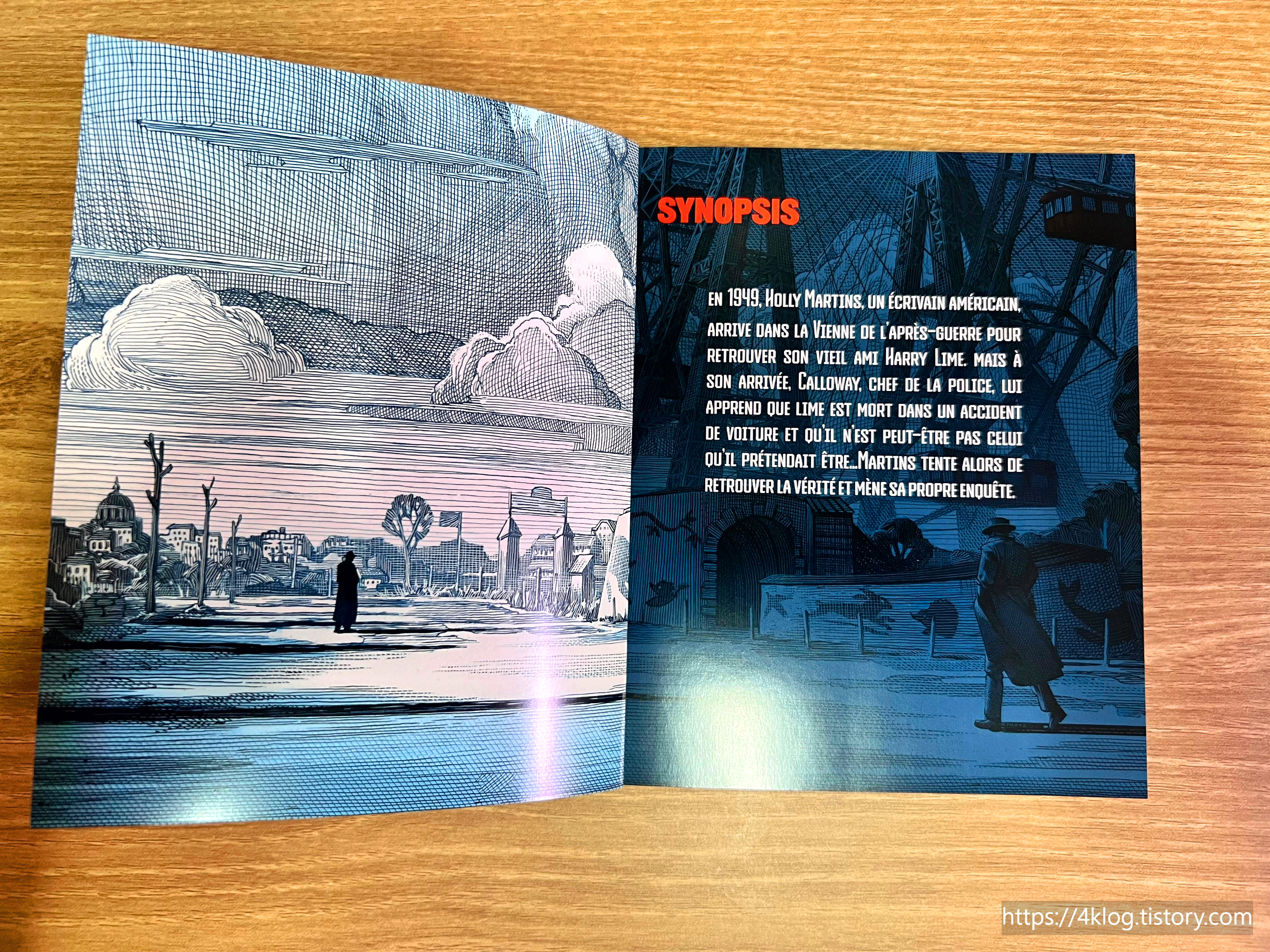 프랑스판 4K 블루레이는 슬립박스로 감싼 디지팩 형태로 제공되며, 내부에는 4K UHD 디스크와 블루레이 디스크가 각 1장씩 수납되어 있다. 디지팩 내부 아트워크는 영화의 대표 장면인 비엔나 하수도 추격 장면을 기반으로 인쇄되어 있으며, 특유의 필름 누아르 분위기를 고스란히 전달한다. 함께 제공되는 북클릿에는 영화 해설, 캐롤 리드 감독과 작가 그레이엄 그린의 작업 일화, 그리고 복원 과정에 대한 상세한 설명이 포함되어 있어 읽는 재미를 더한다.
