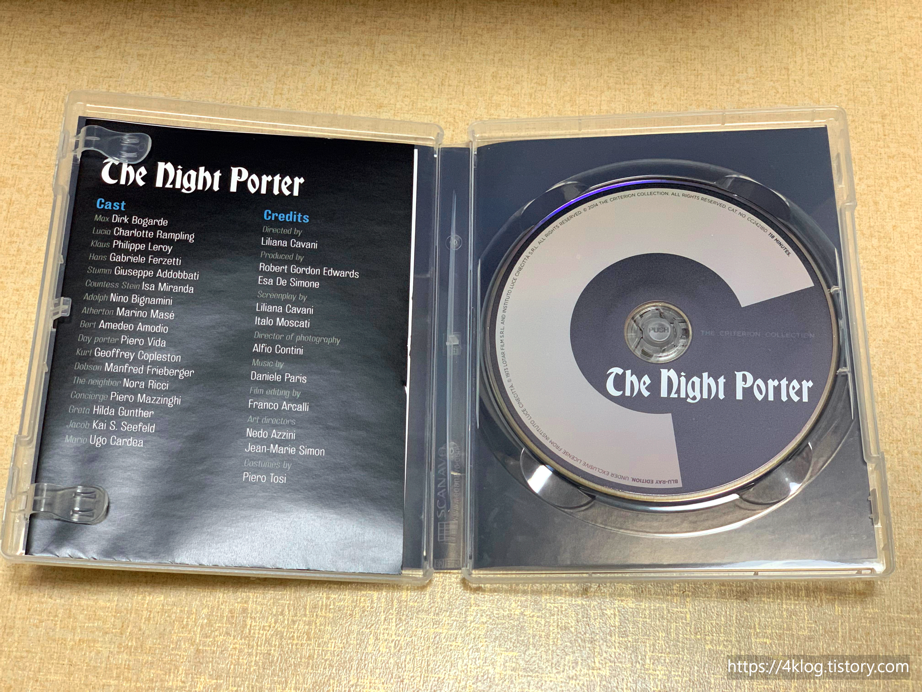 내부에는 디스크 1장과 1975년 릴리아나 카바니 감독 인터뷰 발췌문과 에세이가 실린 삽지가 포함되어 있다. 디스크는 흑백 대비의 미니멀한 타이포그래피로 마감되어 있으며, 크라이테리언 특유의 절제된 미학이 느껴진다.